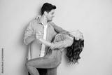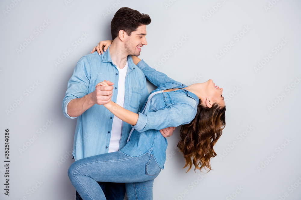 Portrait of positive affectionate tender gentle spouses hug hold hand embrace dance enjoy honeymoon date wear good look clothes isolated over gray color background