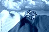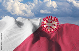 Flagge von Polen mit Corona Virus und blauer Himmel mit Wolken im Hintergrund.