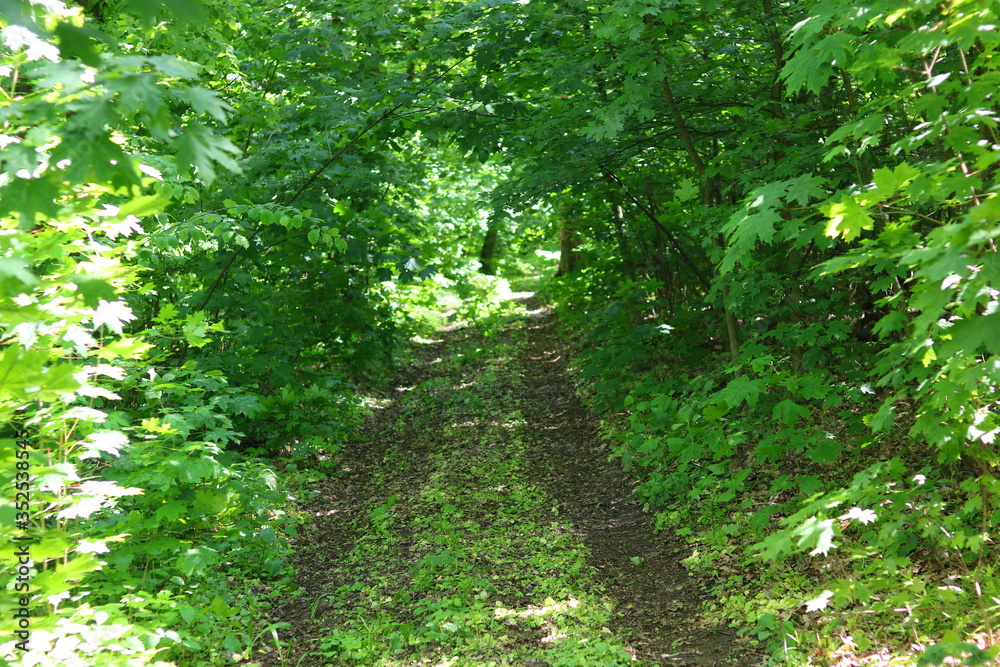 Summer forest landscape with vibrant forest green plants, forest trees and forest road