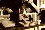 Restaurant worker wearing protective mask and gloves packing food boxed take away. Food delivery services and Online contactless food shopping.