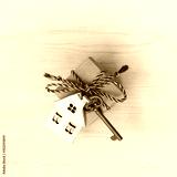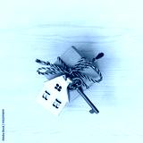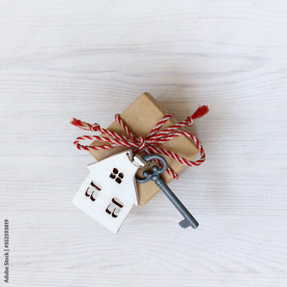 house with a key tied to a gift on a light wooden surface. holiday offer to stay