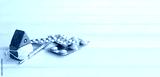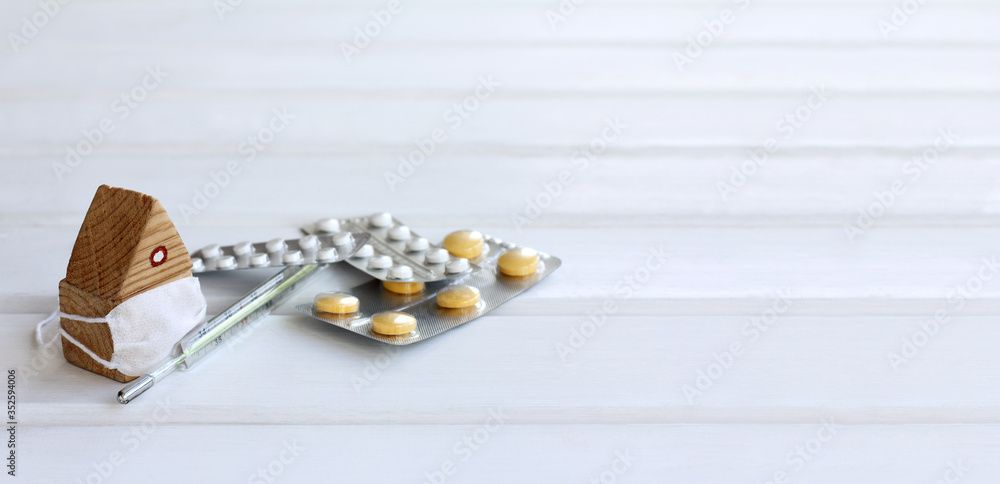 White and yellow tablets with a thermometer and a mock-up of a house in a medical bandage. prevention of viral and bacterial diseases