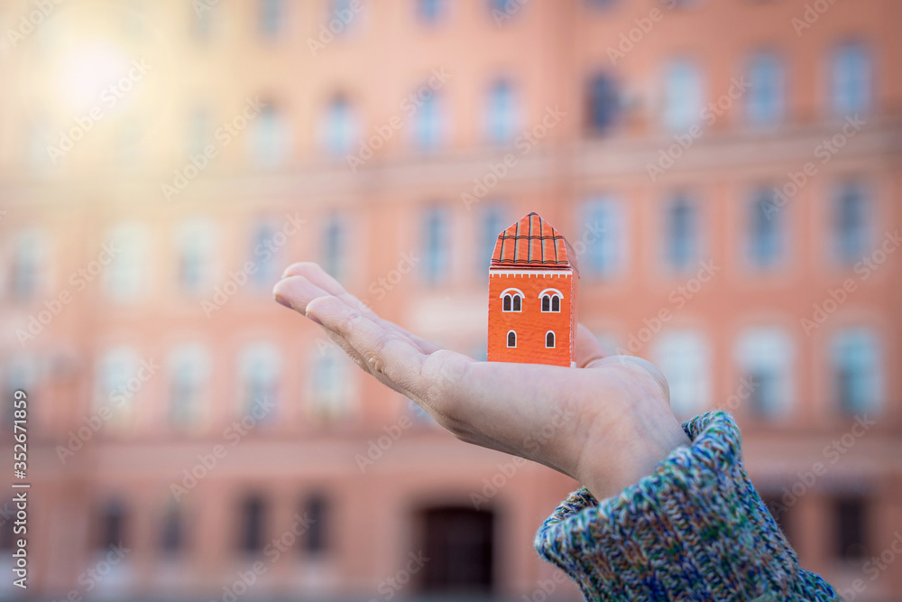house in hand, apartment in the city, a real estate agent is holding a small house in his hand, the concept of buying, selling, renting a house, the dream of owning a house