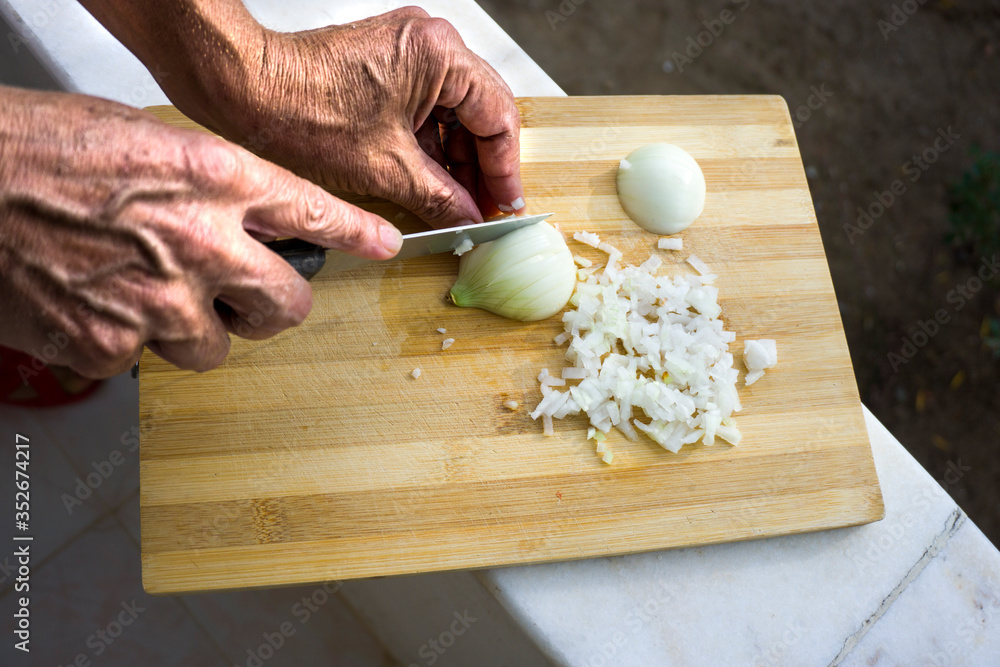 Female hands chopping, cutting white onion with knife on wooden cutting board. Chopped fresh onion pieces. Traditional ingredient for eastern cuisine food culture.