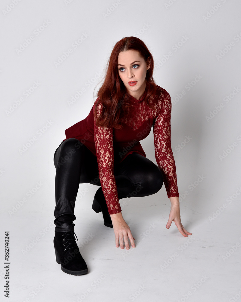 Portrait of a pretty girl with red hair wearing leather pants and long sleeved lace shirt. full length kneeling pose isolated against a studio background
