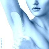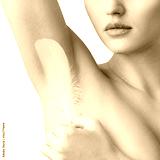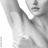 Woman holds white feather near clean armpit. Depilation concept.