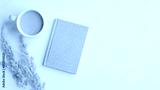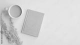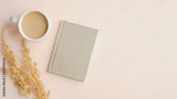 Flat lay, top view home office desk table with cup of coffee, paper notebook and dry flowers on beige background. Elegant feminine workspace, minimalistic style