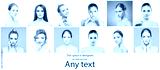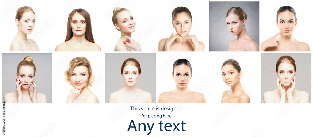 Female portraits in collage. Faces of young and beautiful women. Skin care, face lifting, cosmetics and plastic surgery.