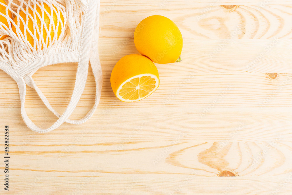 Lemons in cotton shopping eco friendly bag on wooden background with copyspace. Help for colds, natural remedies for the disease