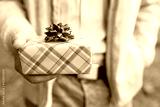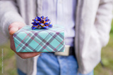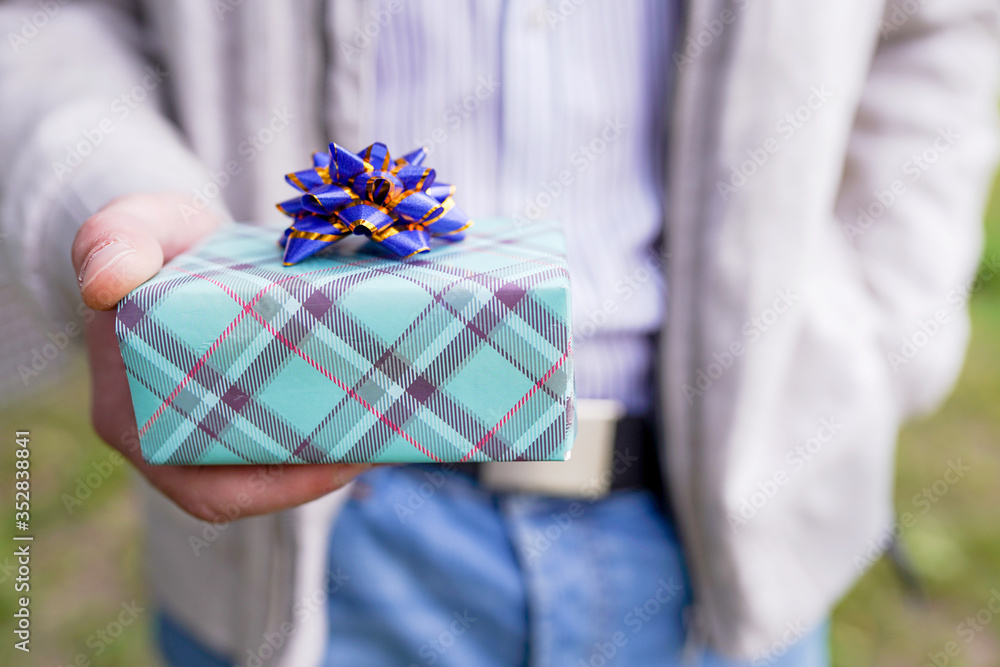 green Gift box with bow in man's hands