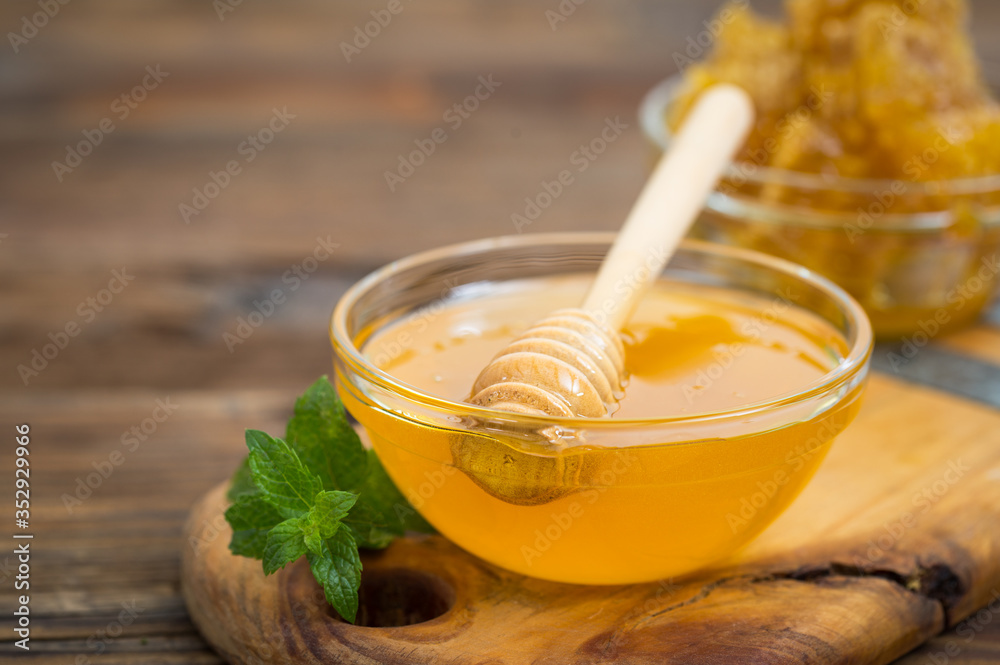 Fresh honey in the bowl, with honeycomb and bee pollen