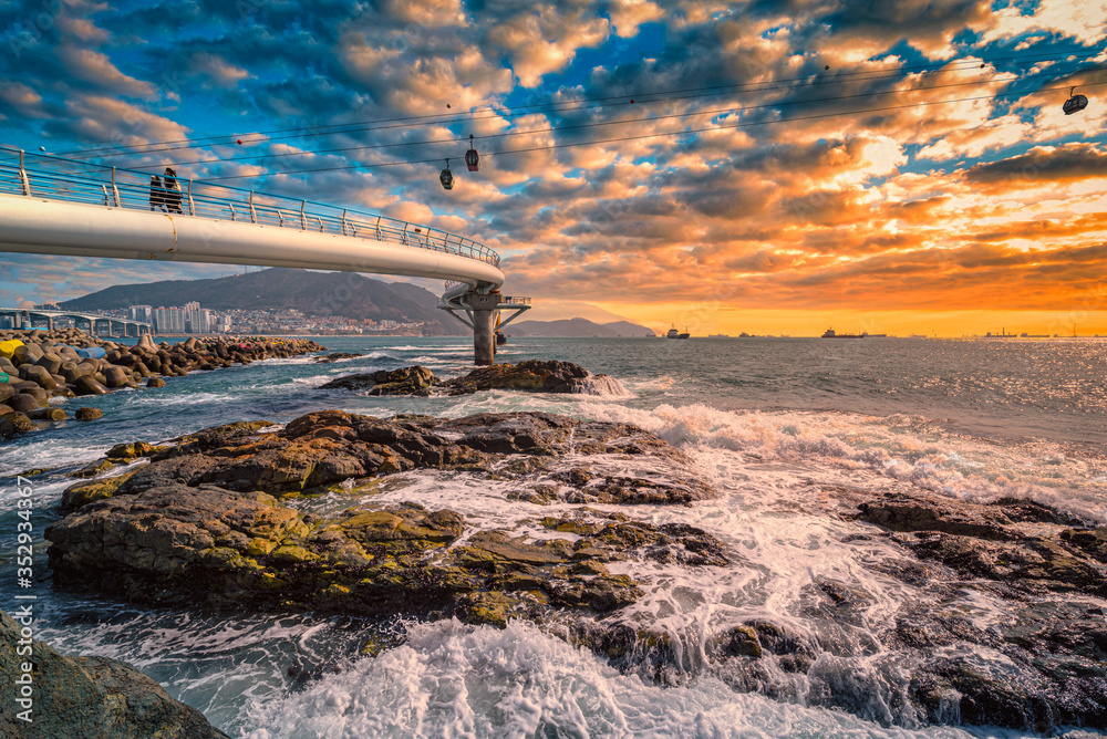 Busan city with Songdo Skywalk at sunset in Busan, South Gyeongsang Province, South Korea.