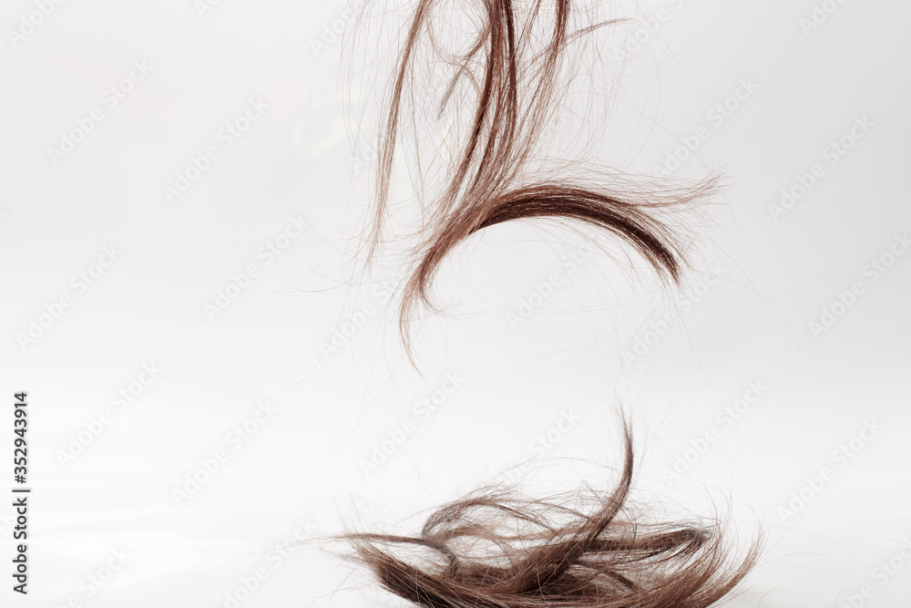 background or texture for a hair salon. a wisp of dry brown hair falls on a light gray background. Part of the cut hair on a white background