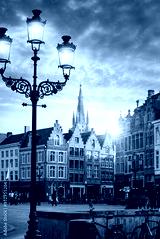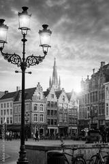 Bruges Belgium. Old town with vintage house at square with glowing lantern and sunset sky. Picturesque landmark in Europe.