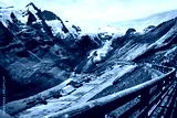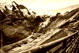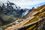 Panoramic view at Pasterze Glacier Grossglockner among austrian Alps mountains summits blue sky clouds.