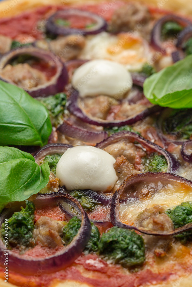 Close up of mini mozzarella on pizza. Macro. Basil lieves, red onion rings.