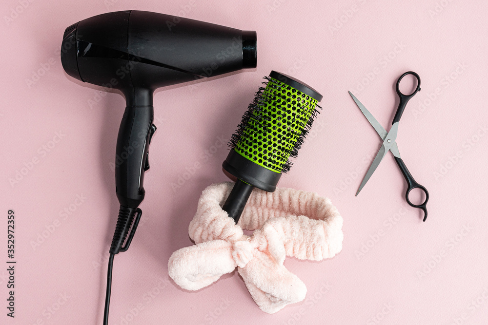 .Professional equipment for hairdresser close-up. Black hairdryer, scissors, comb and bow on a pink background, top view.