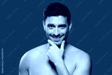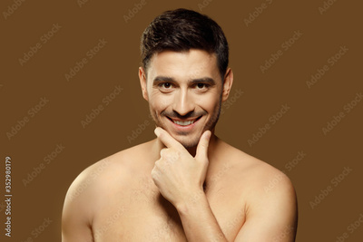 Close-up portrait of young man standing isolated on brown background, looking at camera with cunning smile and holding his chin as if flirting. Men beauty skin care ads