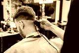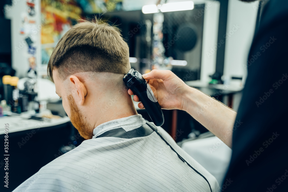 Male haircut with electric razor. Barber makes haircut for client at the barber shop by using hairclipper. Man hairdressing with electric shaver.