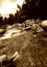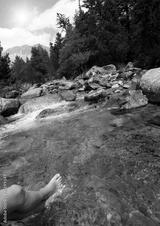 Woman with her feet on a mountain river