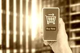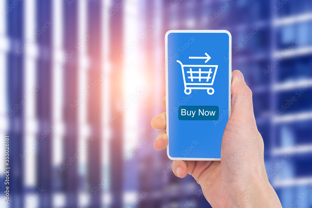 In front of the business building, a closeup of a man's hand holding a mobile phone for online shopping.