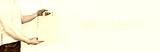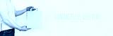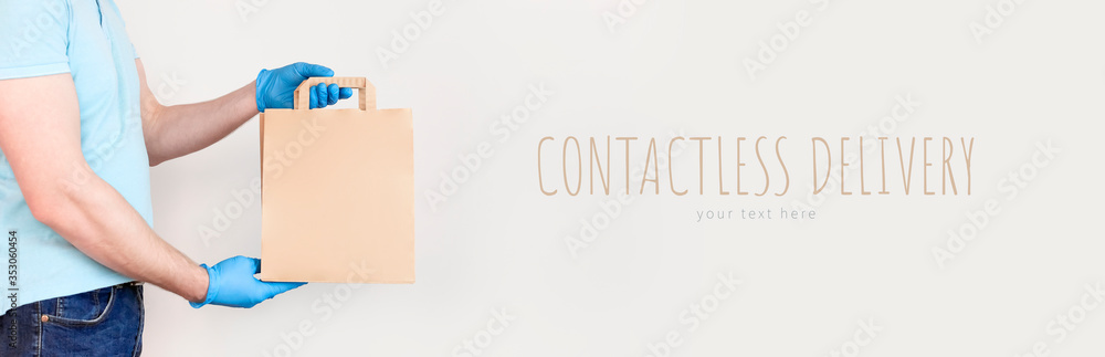 Delivery against Coronavirus 2019-nCov in pandemic Contactless delivery. Male hand in blue medical gloves holds craft paper bag on white background. Concept of delivery of goods food during quarantine