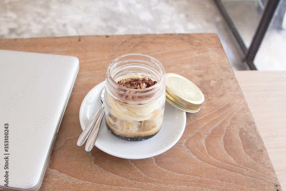 Delicious Banoffee in Mason jar on wood background