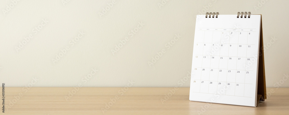 Calendar page close up on wood table with white wall background business planning appointment meeting concept
