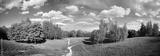 Beautiful bright colorful summer landscape park with green grass field, trees against blue sky with white clouds and winding path on sunny day. Panorama.