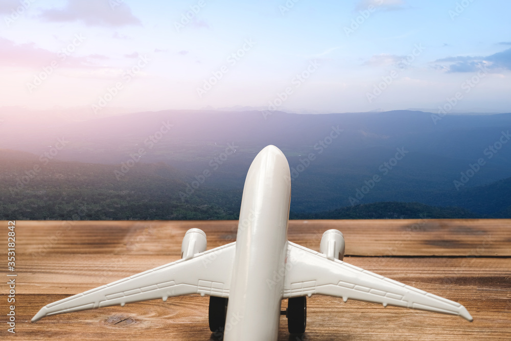 Mountain landscape with a view of the forest and white model of passenger plane on old wooden background. Travel saving and planning concept