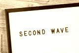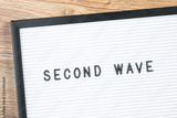 Second wave text on white letter board on wooden desk. Warning sign or newspaper caption. Second wave of virus or peak. Beware notice with copy space