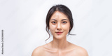 Comparison Asian women before and after applying makeup, Portrait asian girl compare fresh skin and makeup.