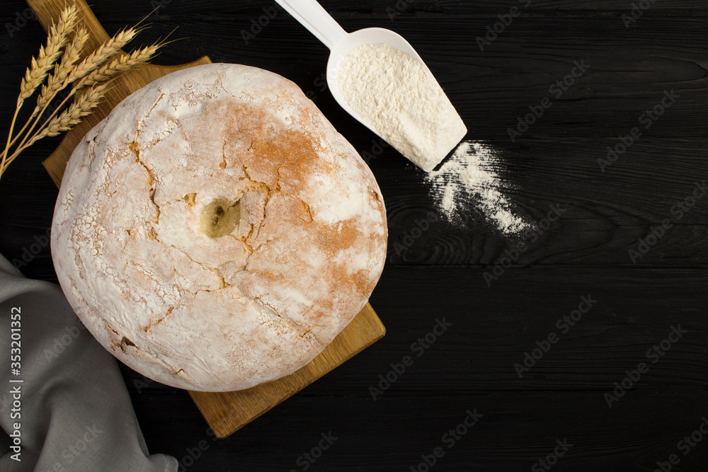 Homemade wheat bread on the brown cutting board on the black wooden background. Top view. Copy space.