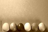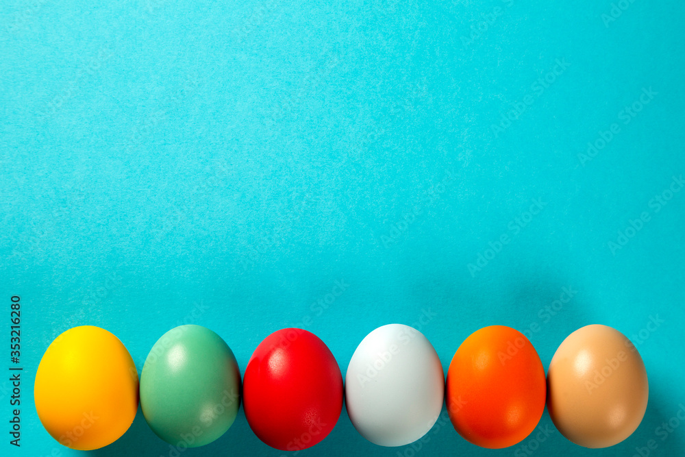 Multicolored Easter eggs on blue background.