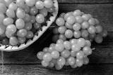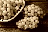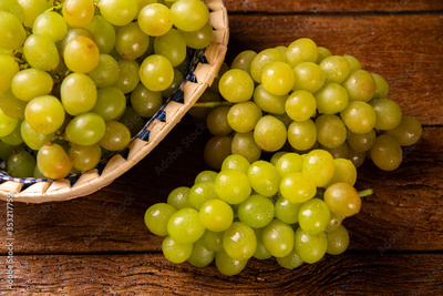 Bunch of green grapes in the basket, fruits of autumn, a symbol of abundance on rustic wood background with copy space, top view, close-up