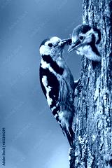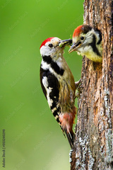 middle spotted woodpecker, dendrocoptes medius, feeding young chick on a nest in tree in summer nature. Careful bird parent in breeding season. Wild animal with red feathers on head.