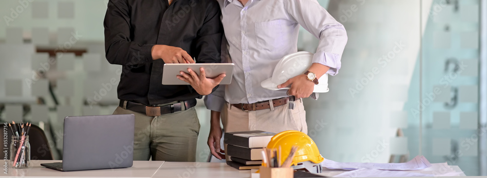 Cropped shot of two engineers working together with digital tablet, laptop and office supplies