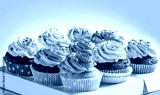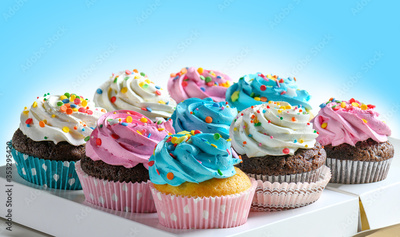 Tasty Cupcakes packaging in delivery box, various cupcakes with pink white and blue cream and colorful sprinkles on blue background