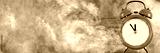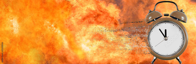 a clock from which particles fly out against a background of flame, which covers the entire space