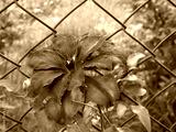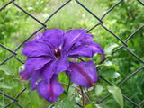 A purple clematis viticella flower, blooms in a garden. Large-Flowered Clematis - Ranunculaceae on a support from a metal netting.