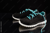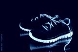 Two black sneakers with blue laces with reflexion isolated on black background