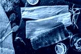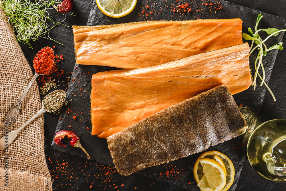 Smoked white fillet fish with spices, bread and oil on slate board over dark stone background. Seafood, top view