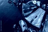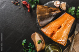 Smoked white fillet fish with spices, bread and oil on slate board over dark stone background. Seafood, top view