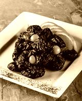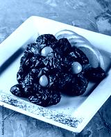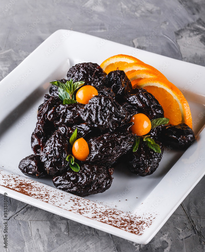Sweet dessert of dried plums with nuts and orange in plate on grey background. Healthy food, dieting