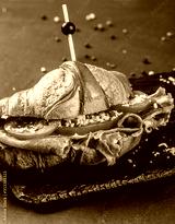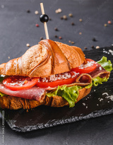 Croissant sandwich with prosciutto, tomatoes, cheese parmesan and greens on black shale board over black stone background. Healthy food concept