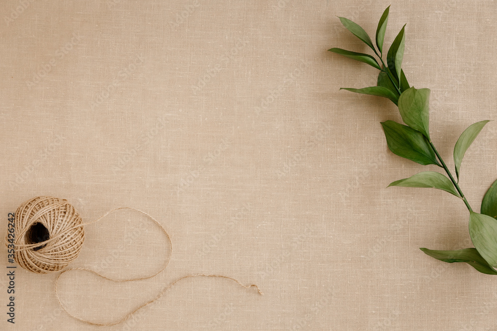 Top view image fashion designer background concept. Flat lay sewing scrapbooking accessory, skein of twine on modern brown linen fabric at home office desk studio.Space for creative design mock up.