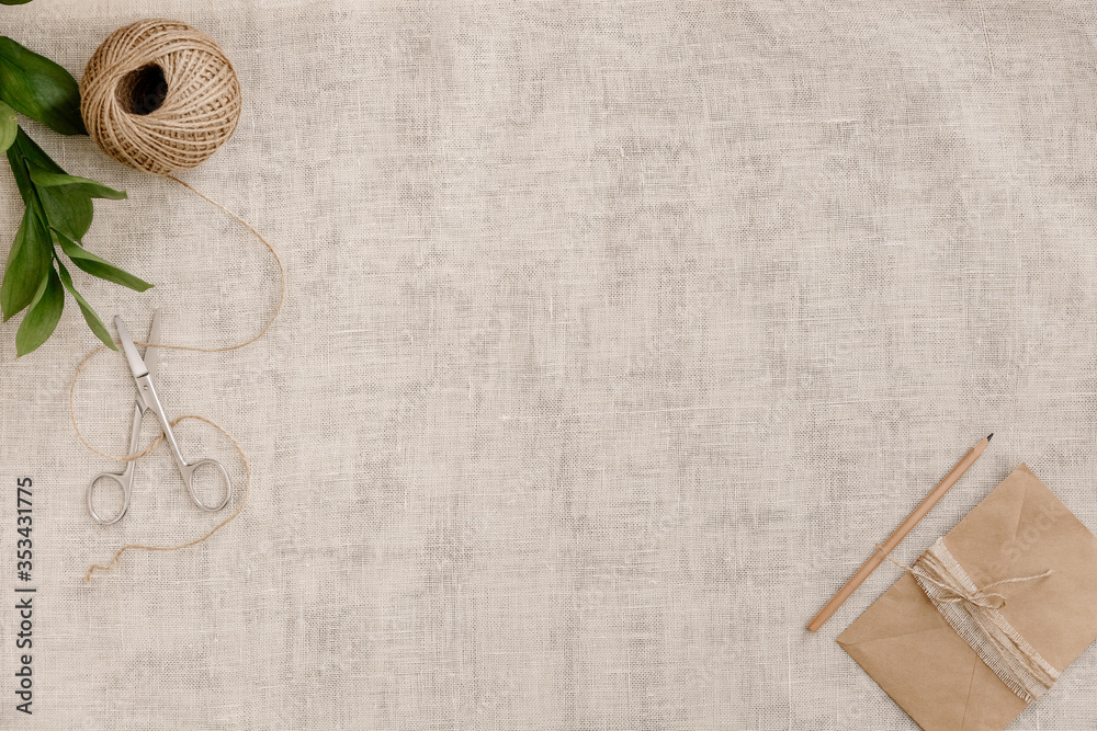 Top view image fashion designer background concept.Flat lay sewing scrapbooking accessory.Scissors, skein of twine, vintage envelope on brown linen fabric at home studio. Space for design mockup