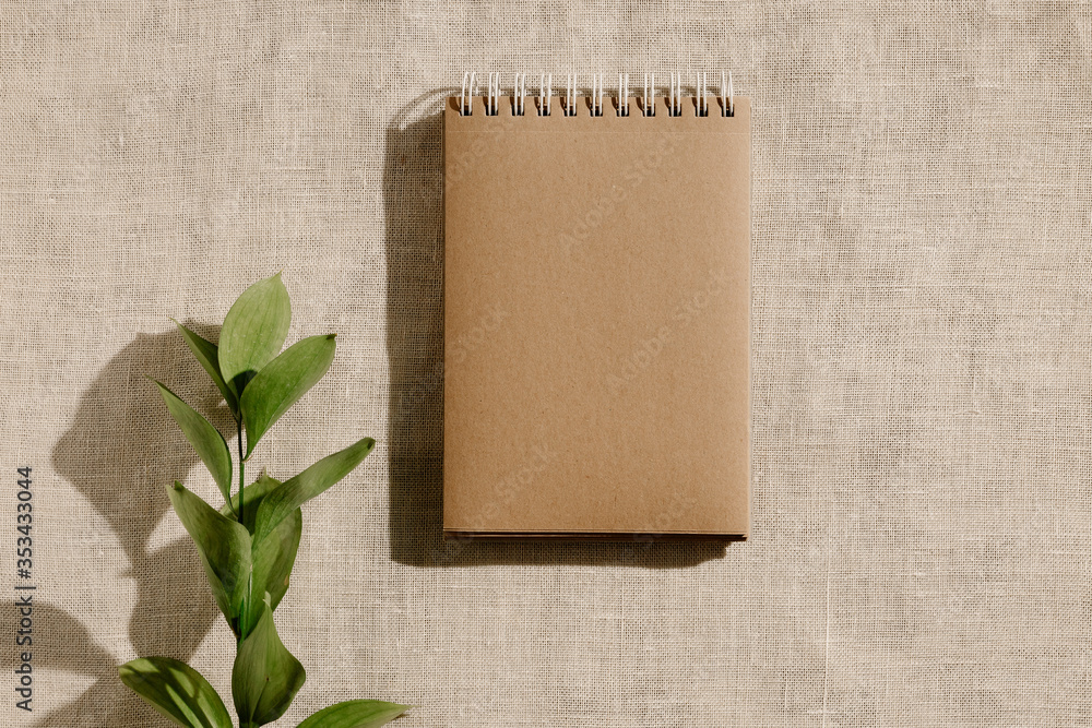 Blank brown vintage notebook, leaves on beige linen fabric in the morning. Minimalistic workplace concept. Top view on background with copy space. Summer flat lay
