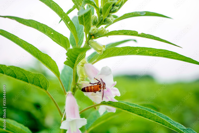 Sesame & Haney bee, seed flower on tree in the field, Sesame a tall annual herbaceous plant of tropical areas cultivated for its oil-rich seeds.