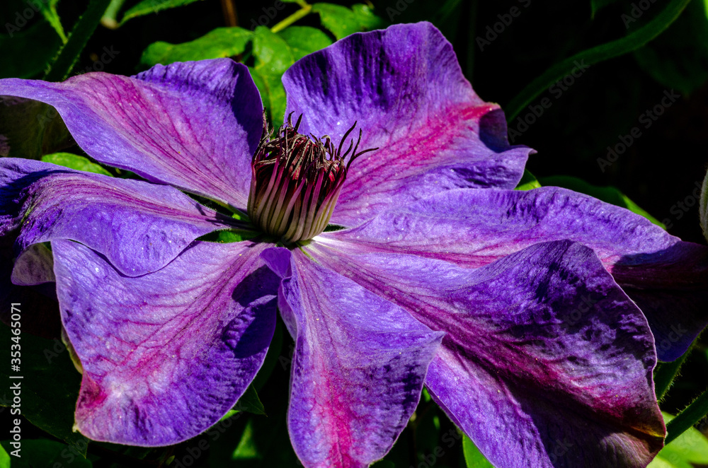 Clematis lila flower botanic beautiful macro or close-up. Purple and violet petals. (selective DOF)